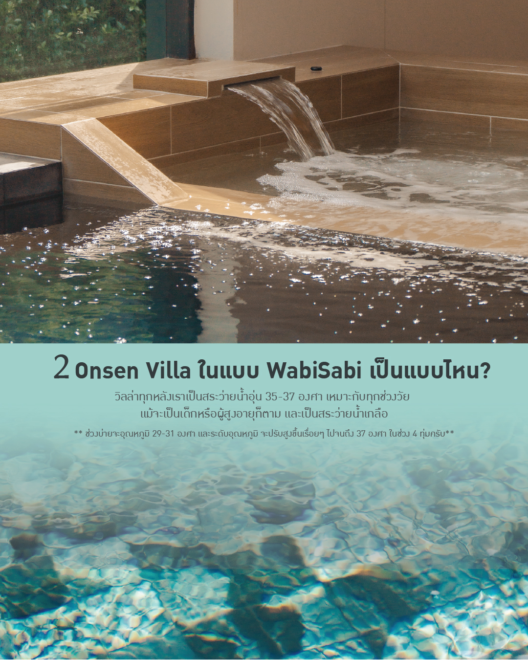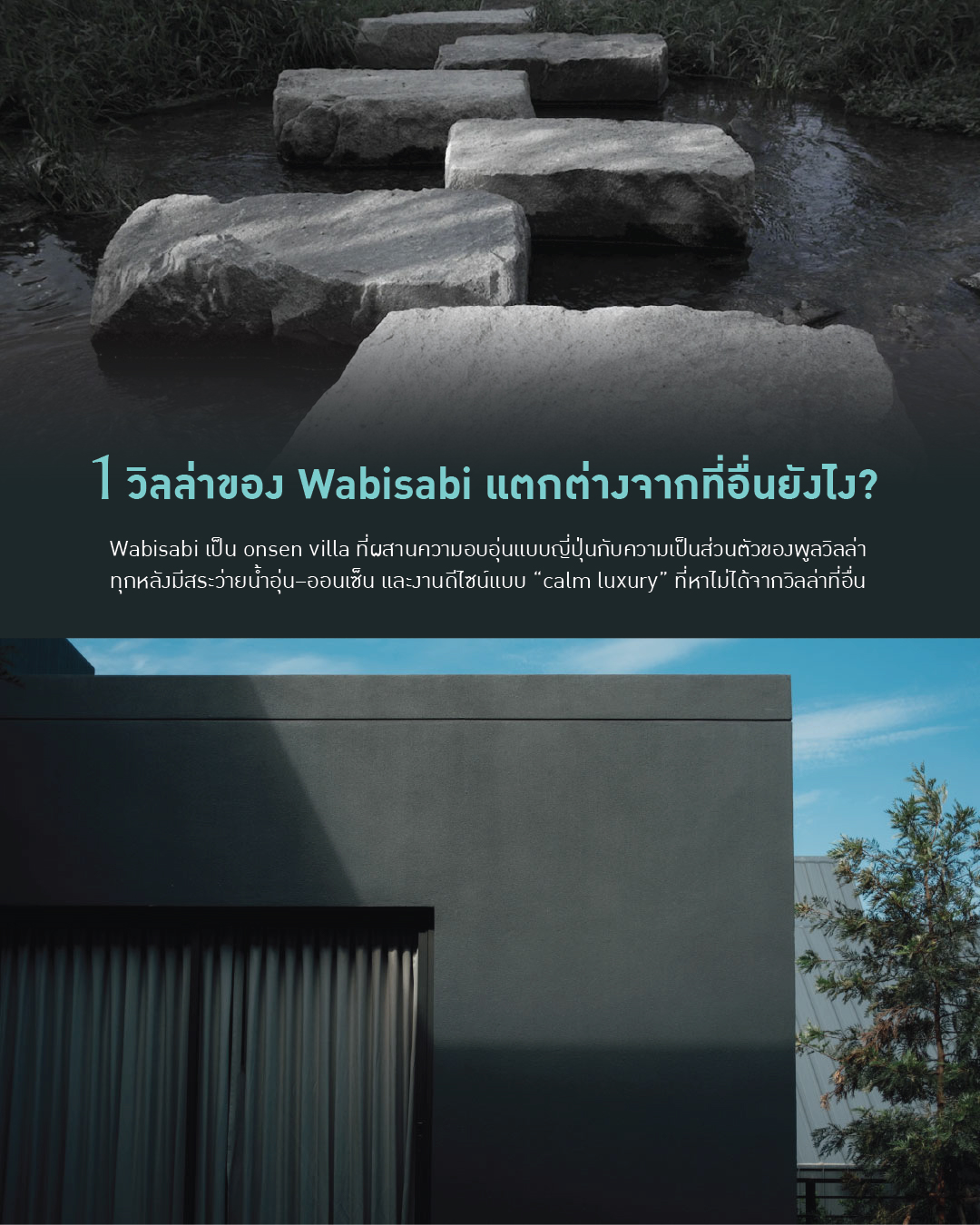 >> Wabisabi เป็น onsen villa ที่ผสมผสานความอบอุ่นแบบญี่ปุ่นกับความเป็นส่วนตัวของพูลวิลล่า ทุกหลังมีสระว่ายน้ำอุ่น-ออนเซ็น และงานดีไซน์แบบ “calm luxury” ที่หาไม่ได้จากวิลล่าอื่น