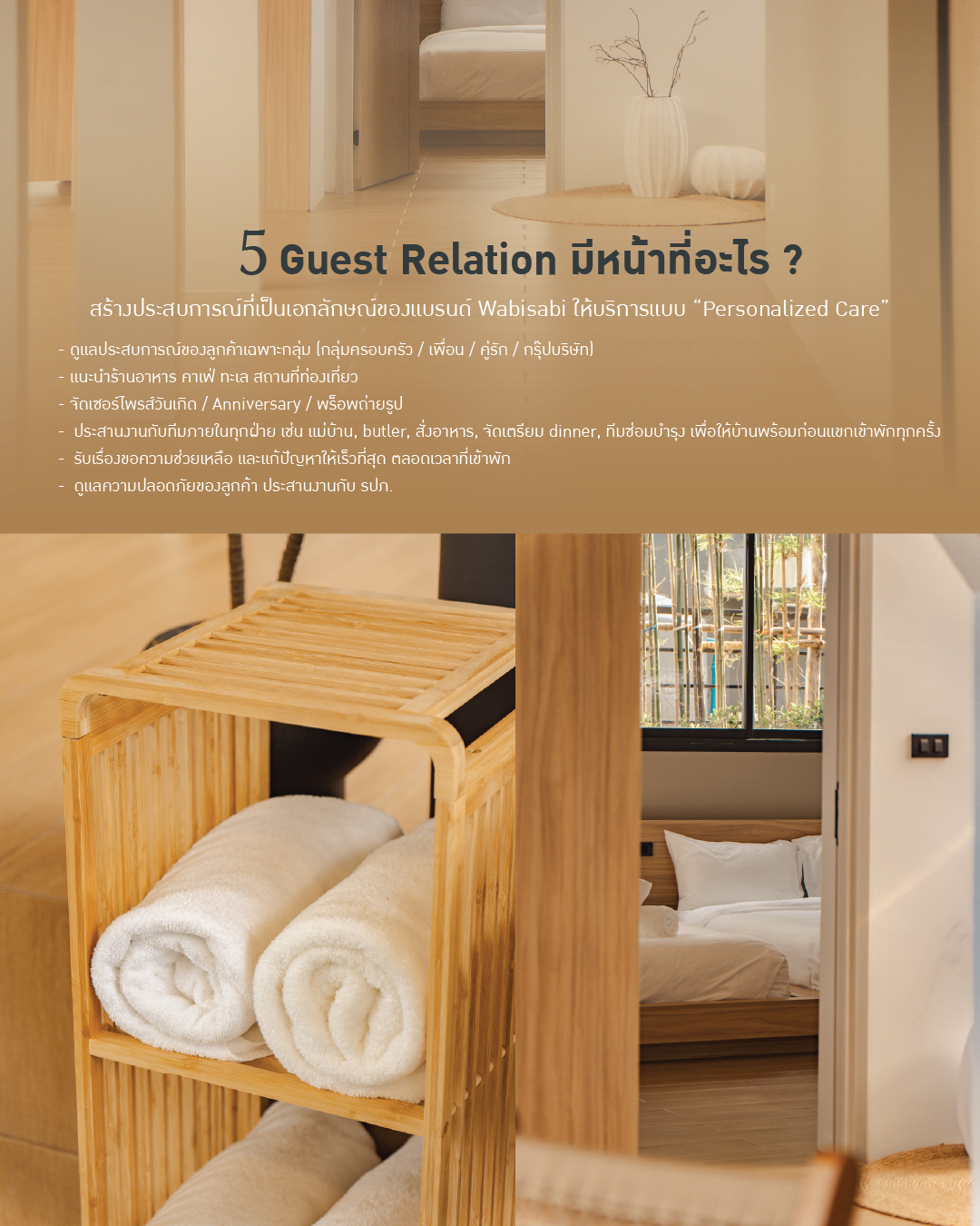 ประสานงานกับทีมภายในทุกฝ่าย เช่น แม่บ้าน, butler, สั่งอาหาร, จัดเตรียม dinner, ทีมซ่อมบำรุง, ดูแลสระว่ายน้ำ เพื่อให้บ้านพร้อมก่อนแขกเข้าพักทุกครั้ง