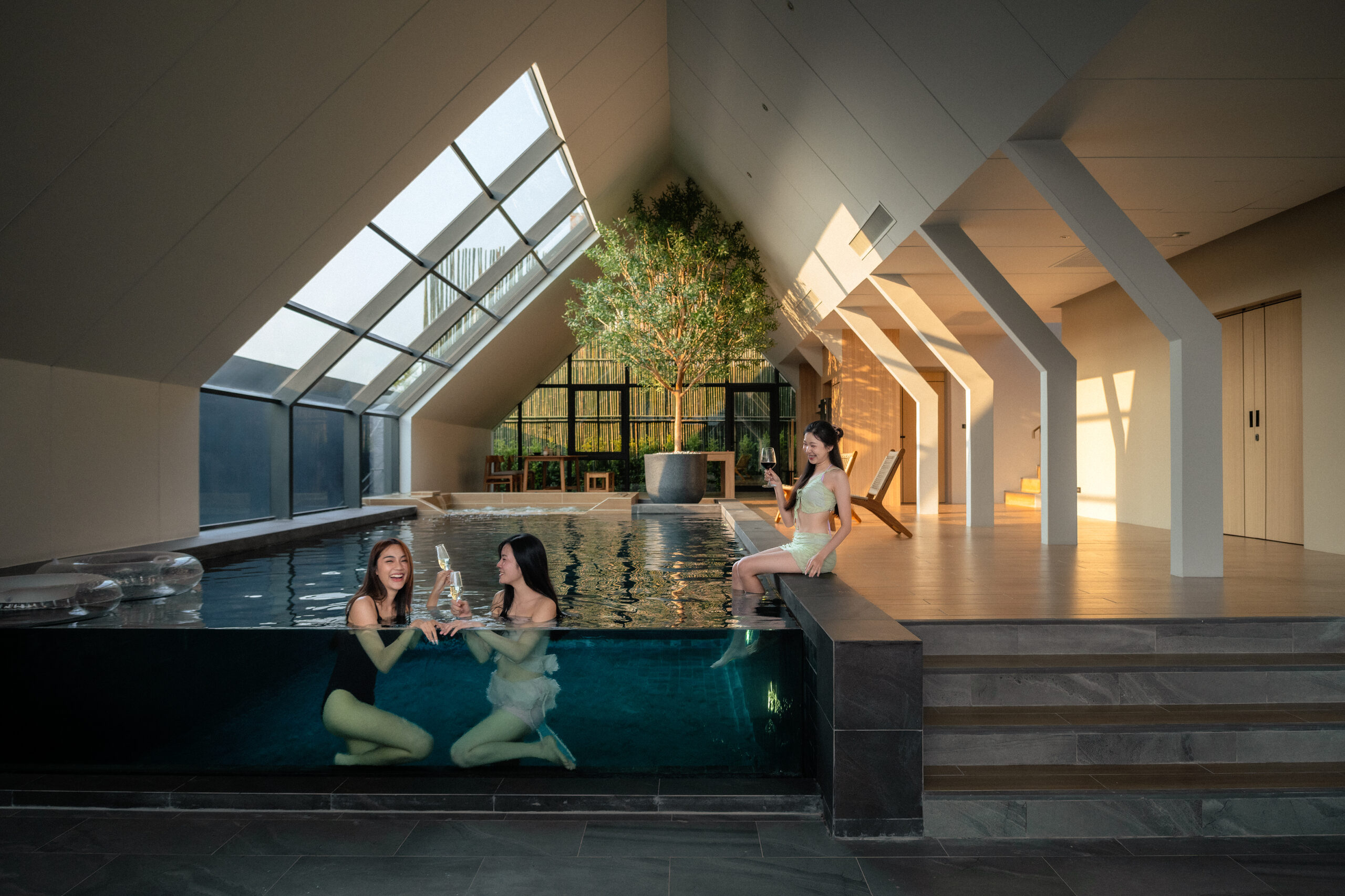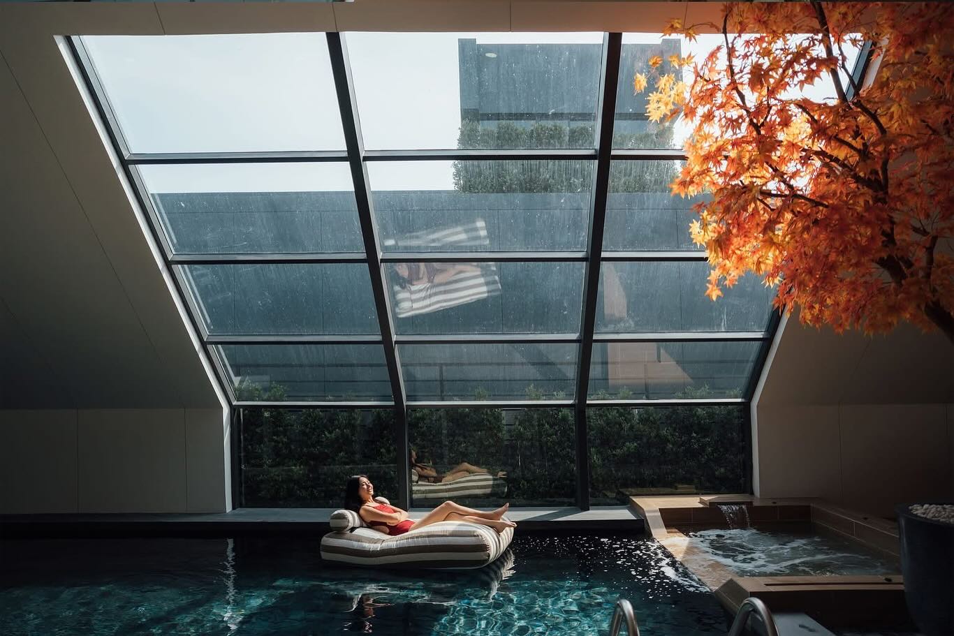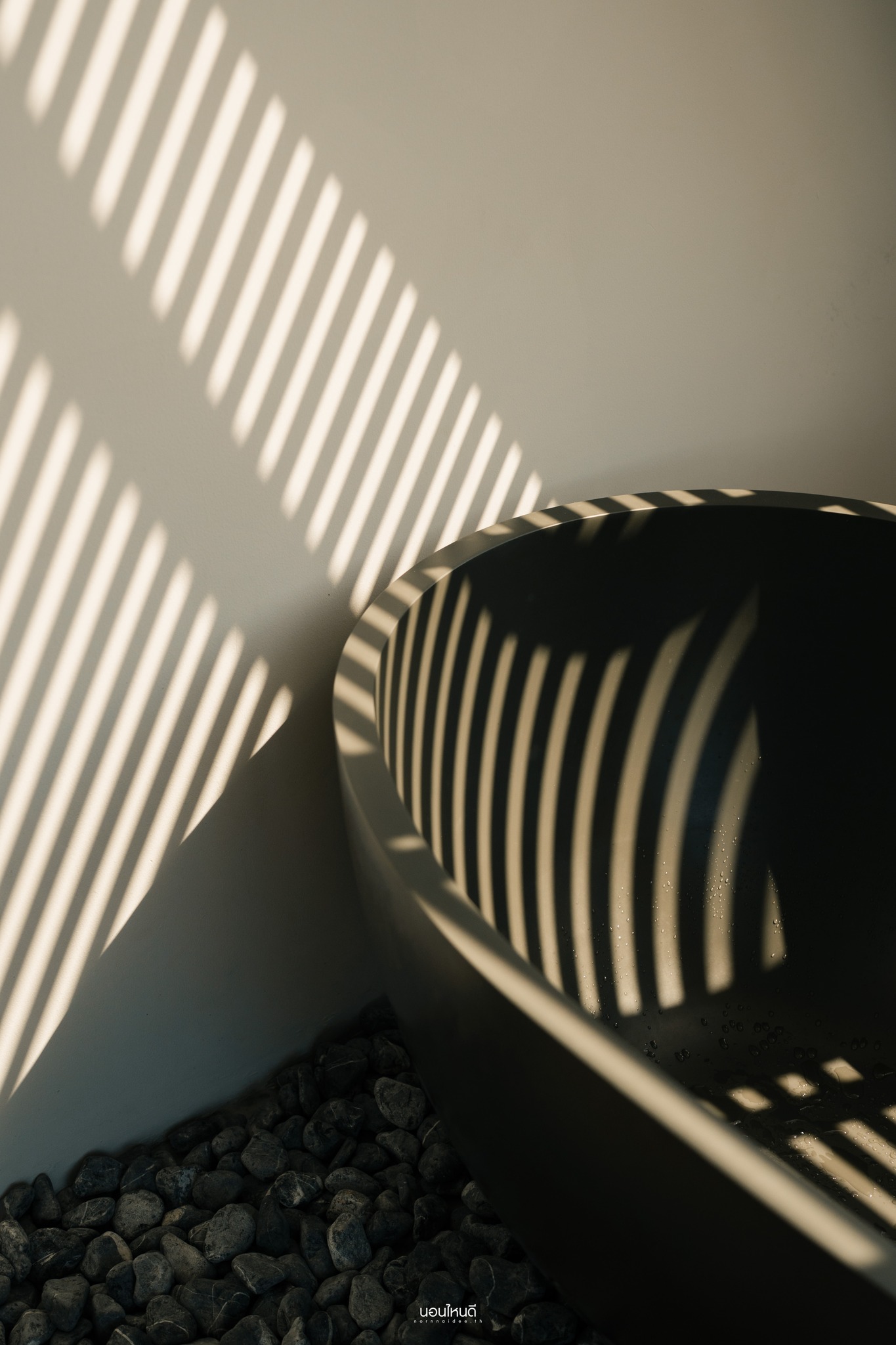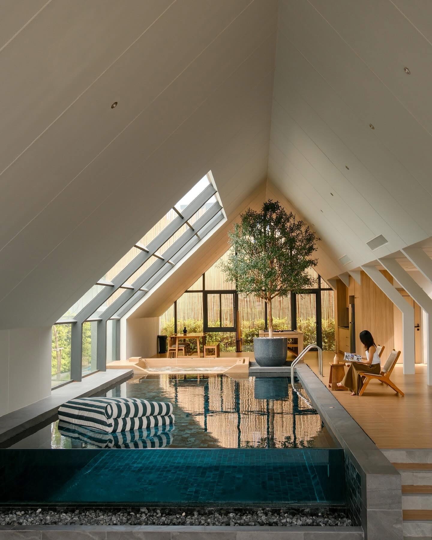 แสงธรรมชาติที่สาดส่องผ่าน Skylight roof มาที่สระว่ายน้ำ แล้วเกิด Reflection ก่อให้เกิดงานศิลป์แบบ WABISABI ที่ทางวิลล่าเราตั้งใจ