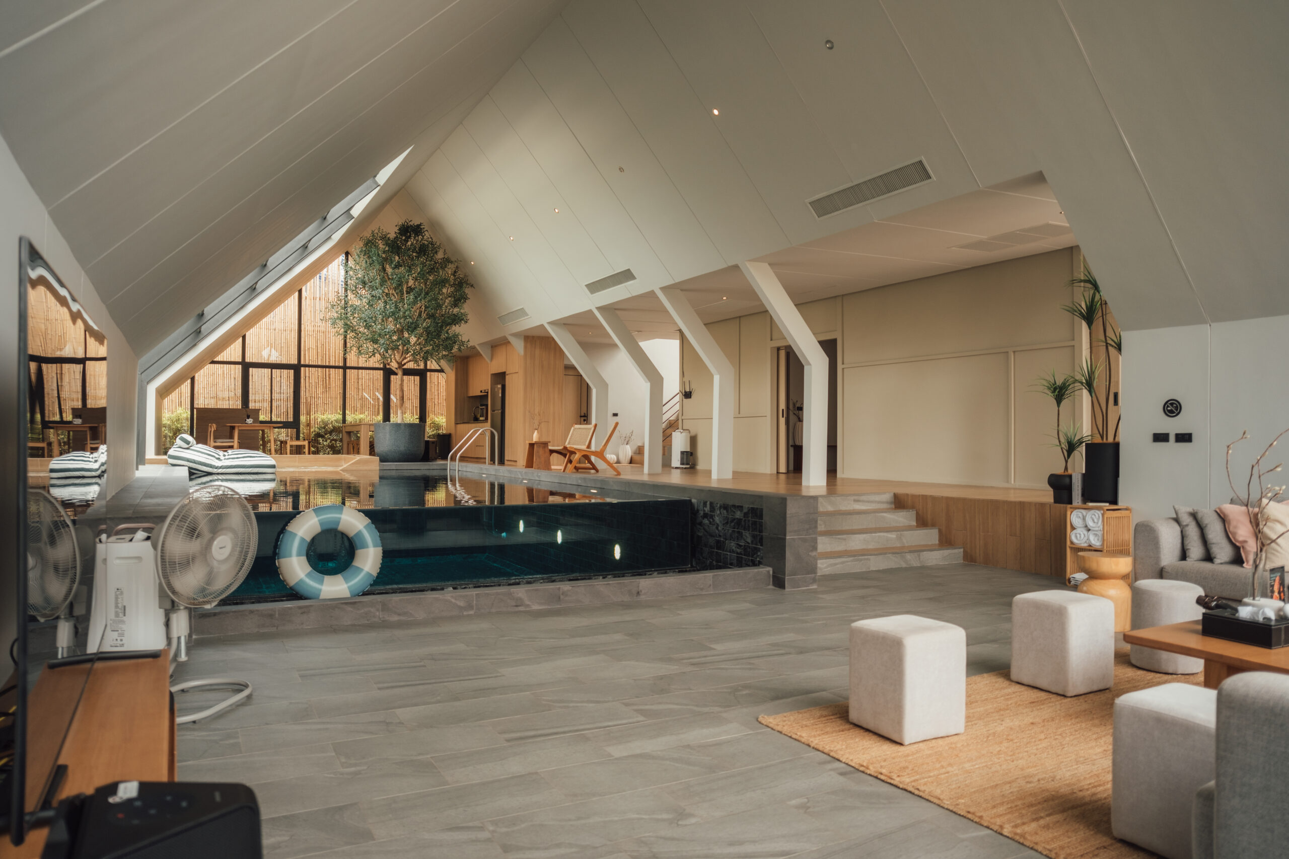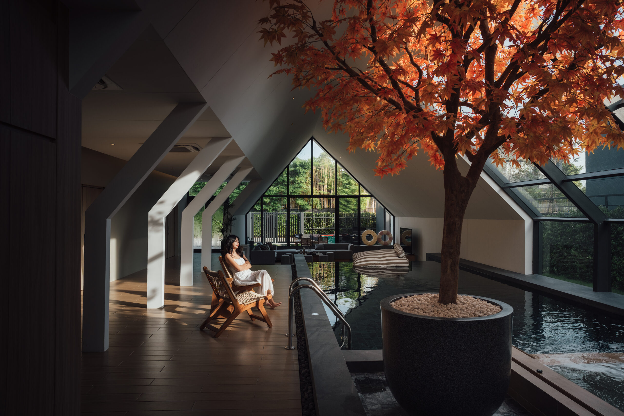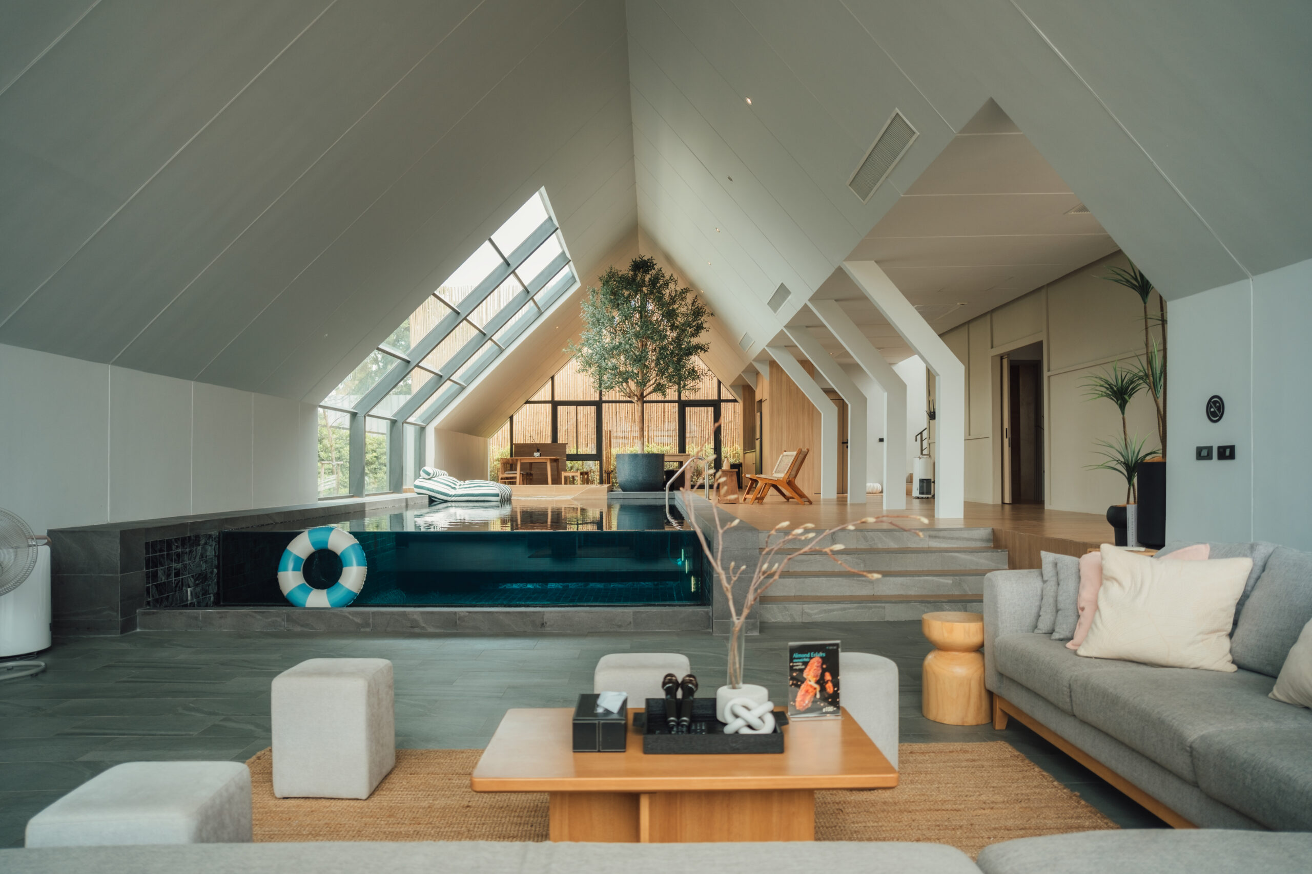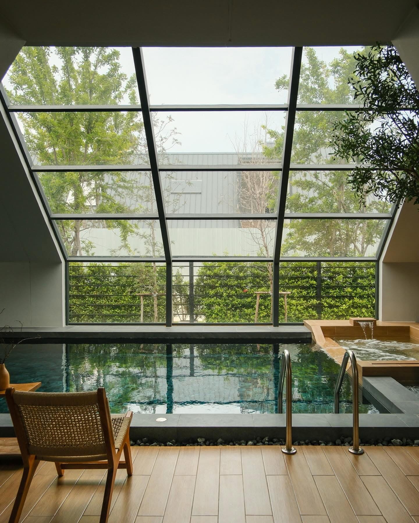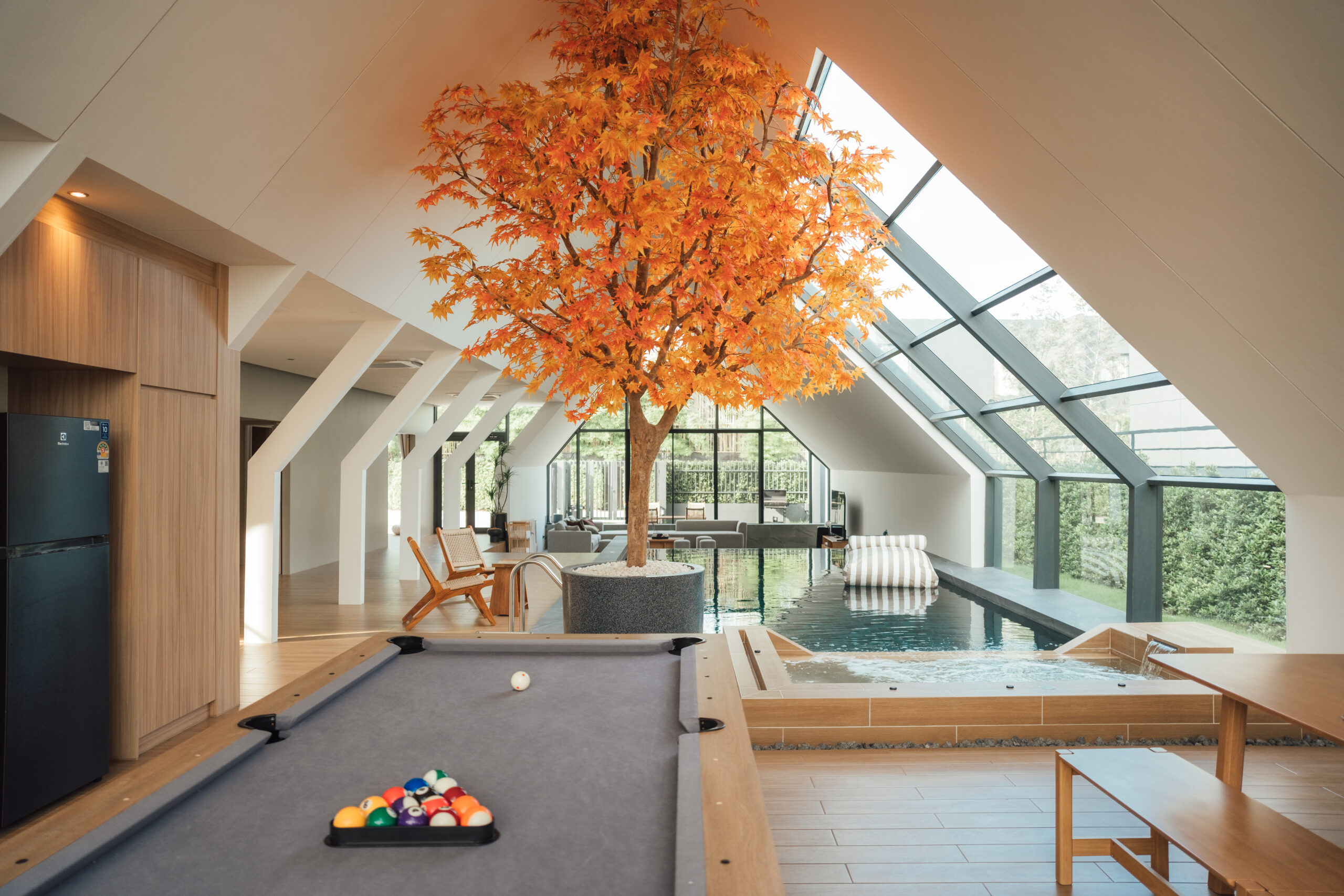 วิลล่ามาใน concept INDOOR POOL สระว่ายน้ำ | ห้องนั่งเล่น | ห้องนอน อยู่ภายในตัวบ้าน เชื่อมต่อทุก function เข้าไว้ด้วยกัน มีจุดเด่นเป็น Skylight roof กระจกบานใหญ่กลางบ้าน ทำหน้าที่เชื่อมต่อธรรมชาติภายนอกสู่ภายในตัวบ้านเข้าไว้ด้วยกัน