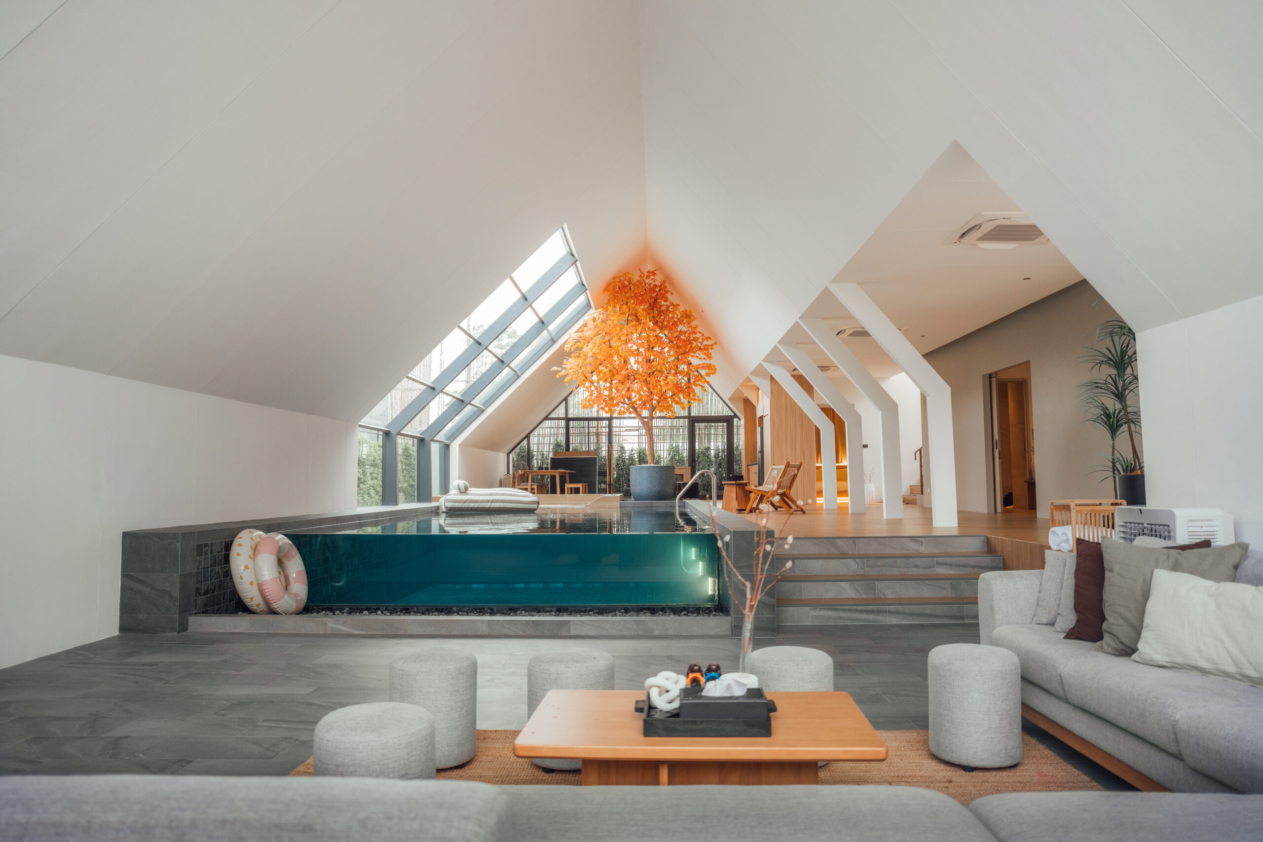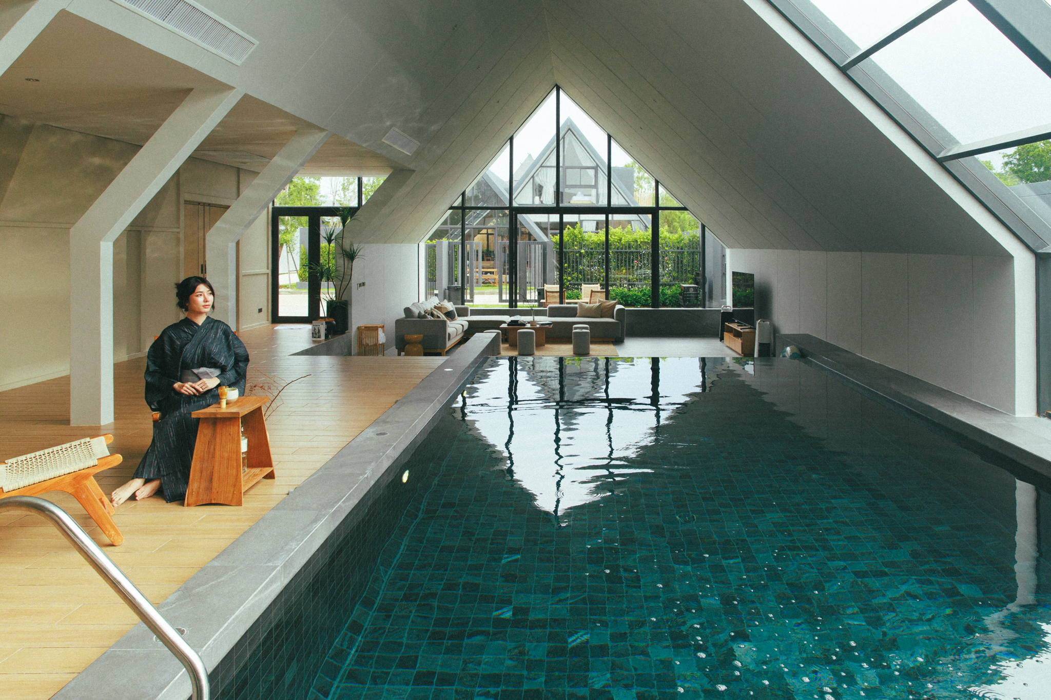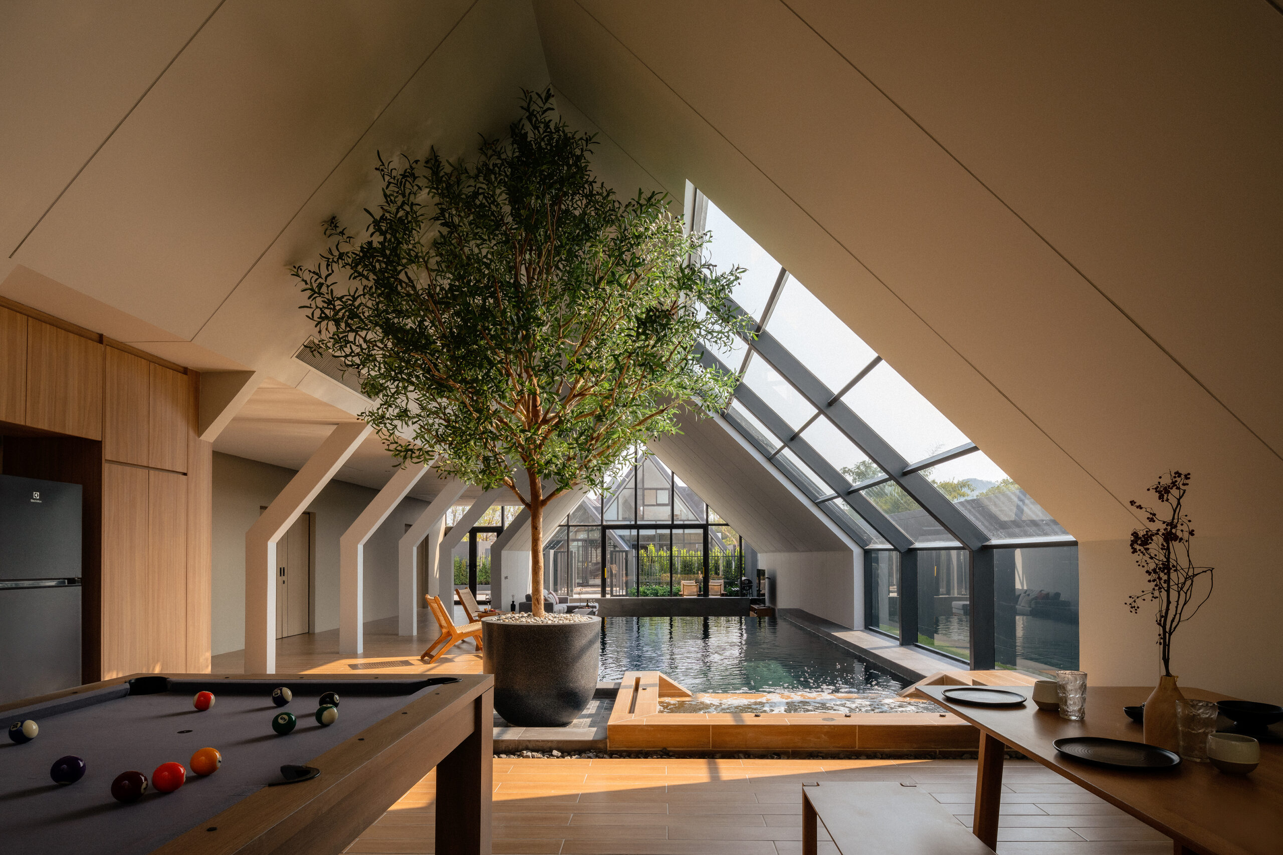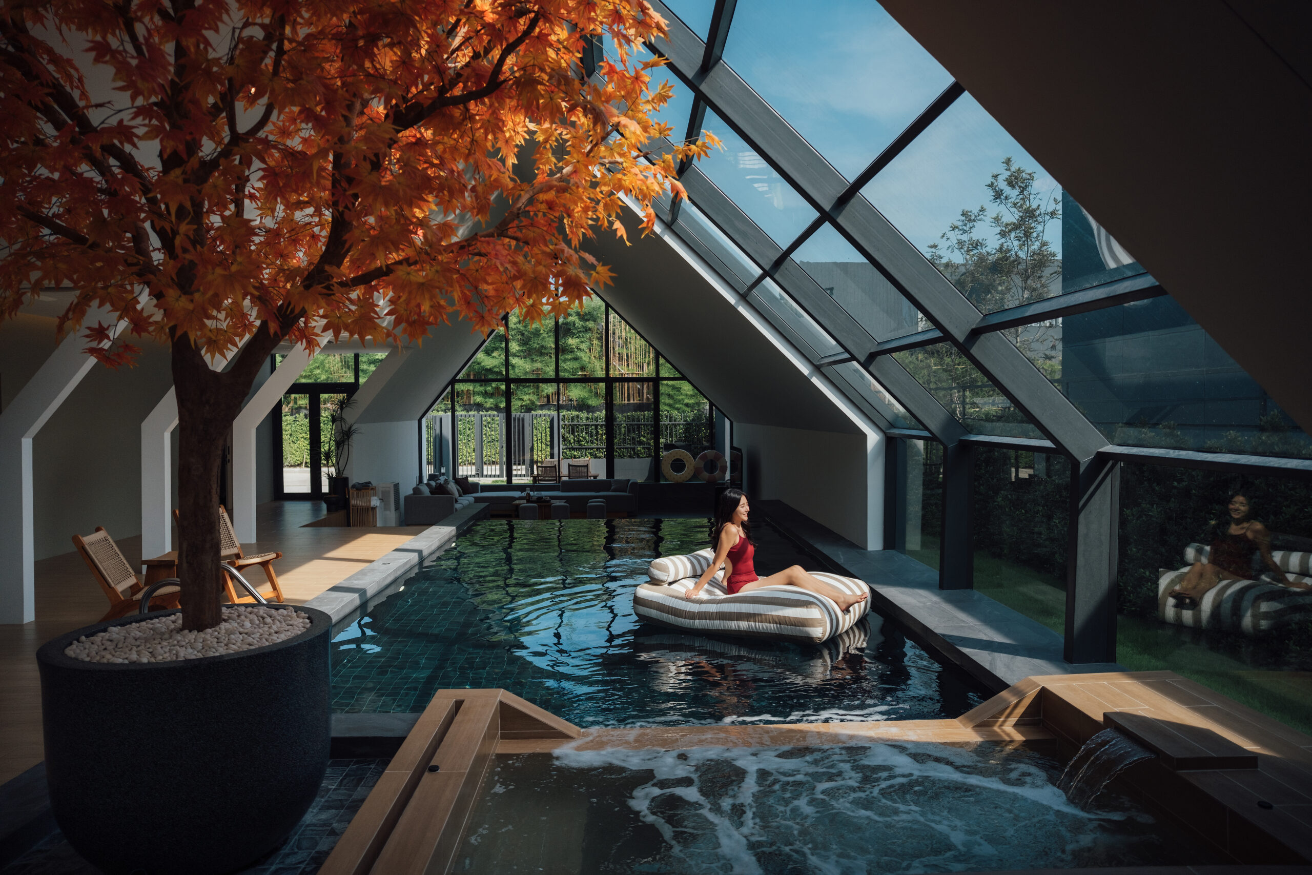 วิลล่ามาใน concept INDOOR POOL สระว่ายน้ำ | ห้องนั่งเล่น | ห้องนอน อยู่ภายในตัวบ้าน เชื่อมต่อทุก function เข้าไว้ด้วยกัน มีจุดเด่นเป็น Skylight roof กระจกบานใหญ่กลางบ้าน ทำหน้าที่เชื่อมต่อธรรมชาติภายนอกสู่ภายในตัวบ้านเข้าไว้ด้วยกัน