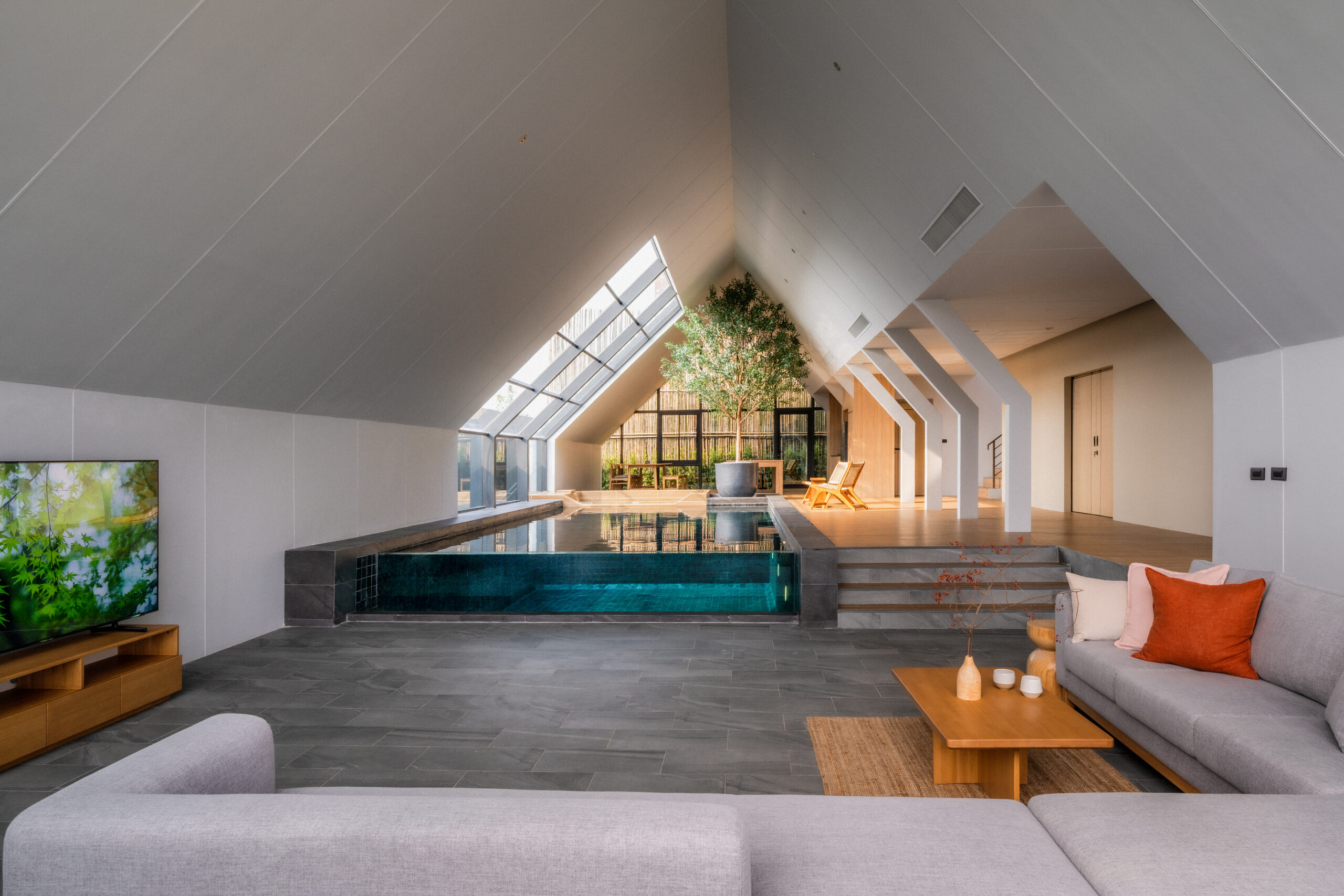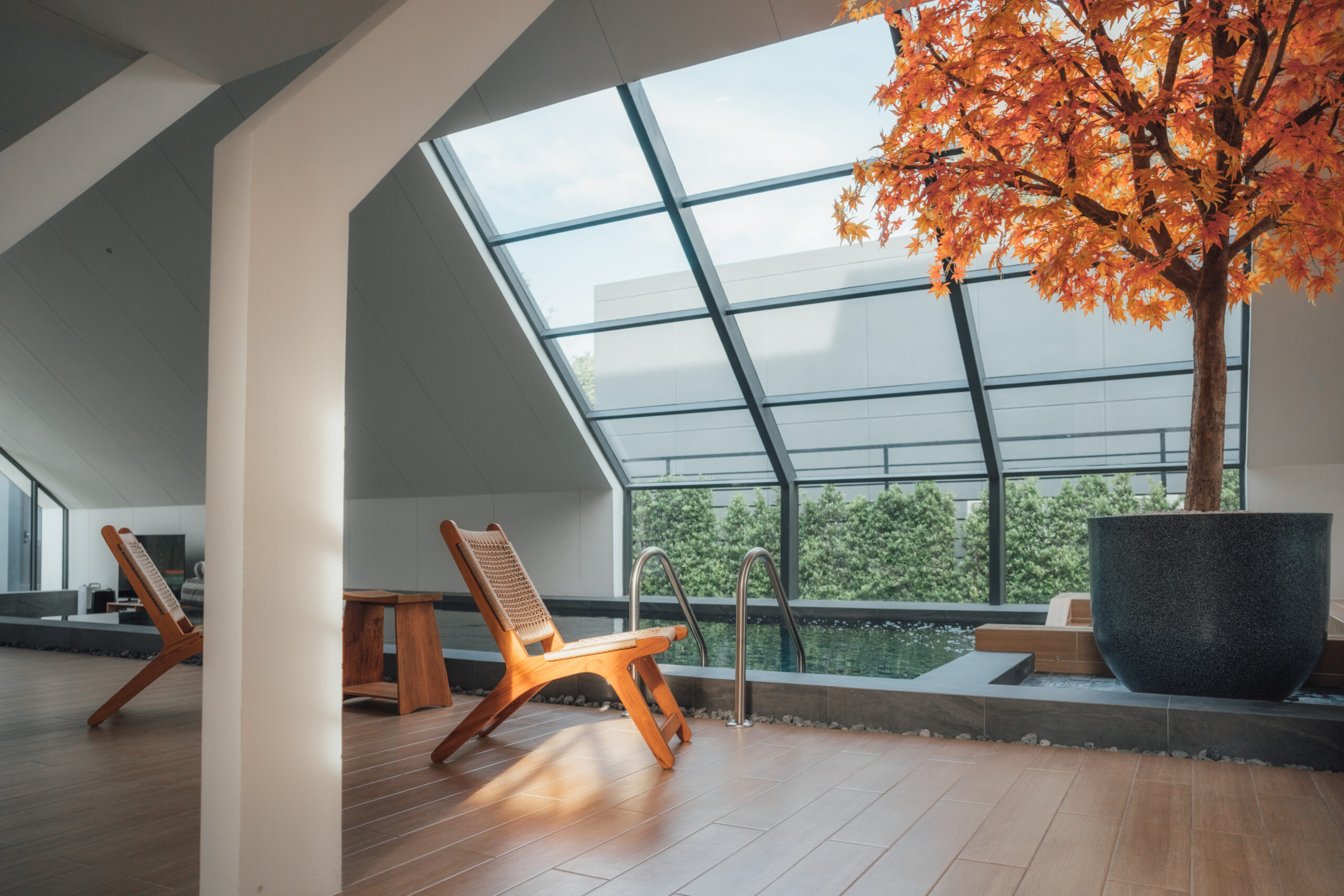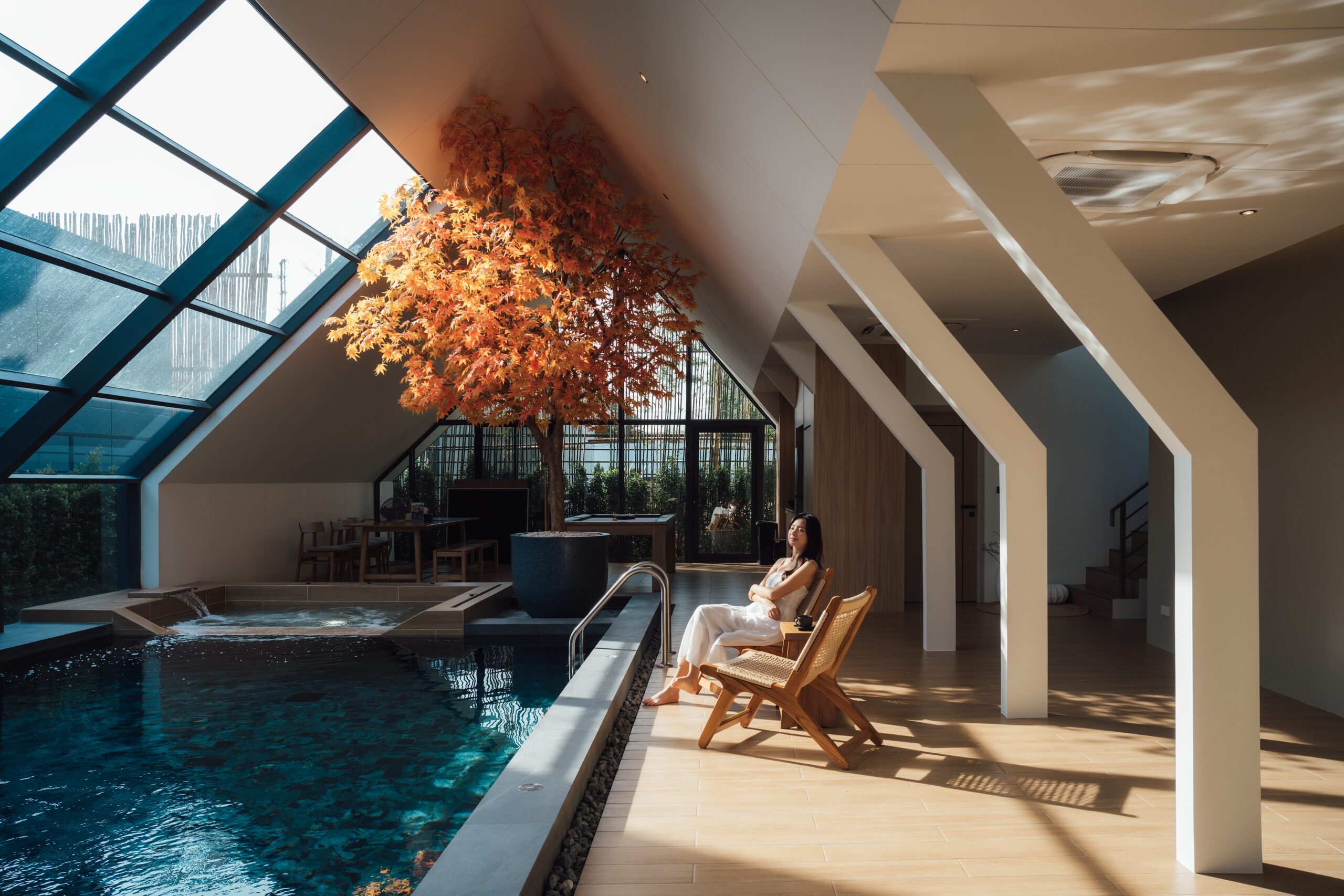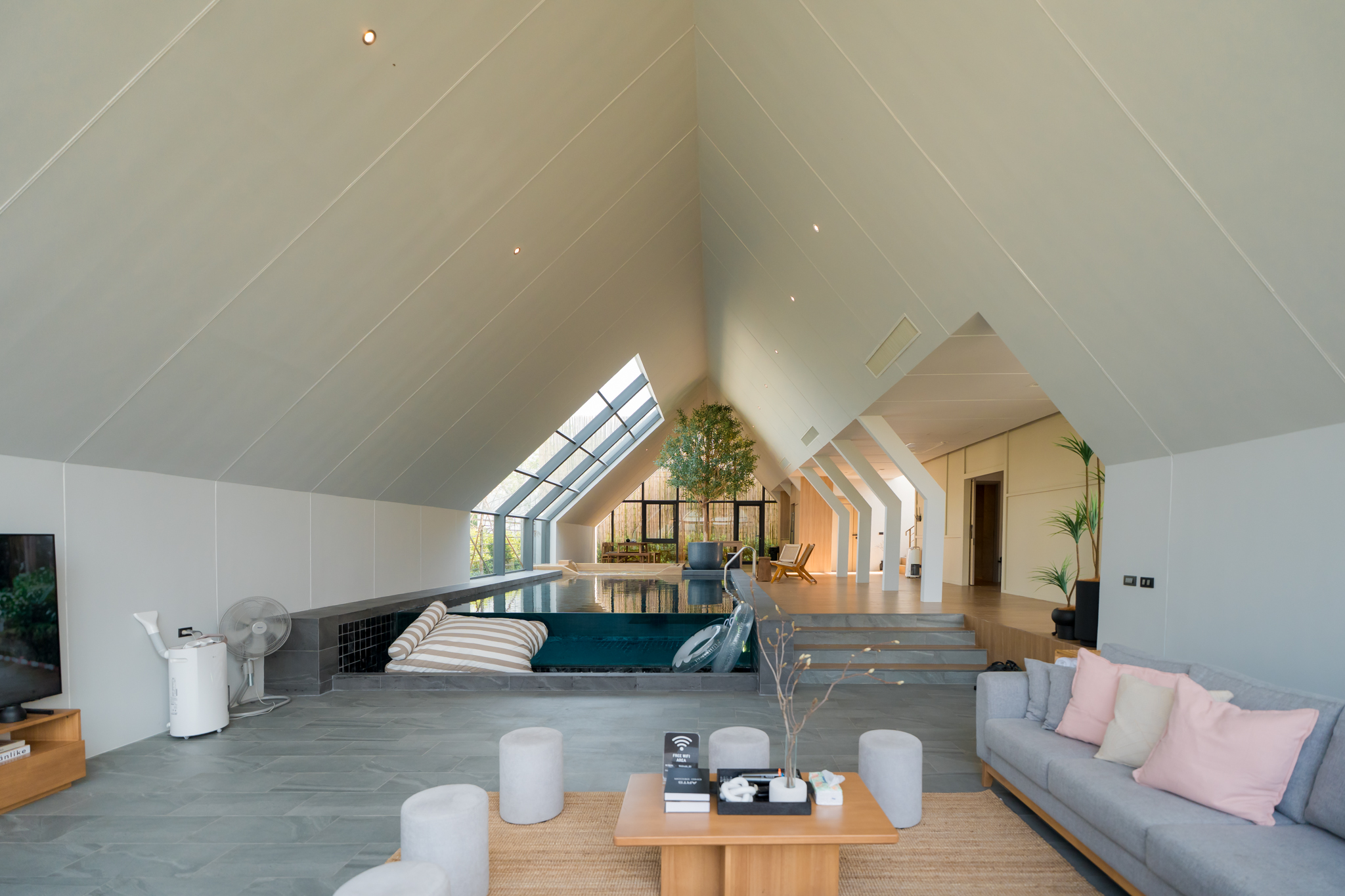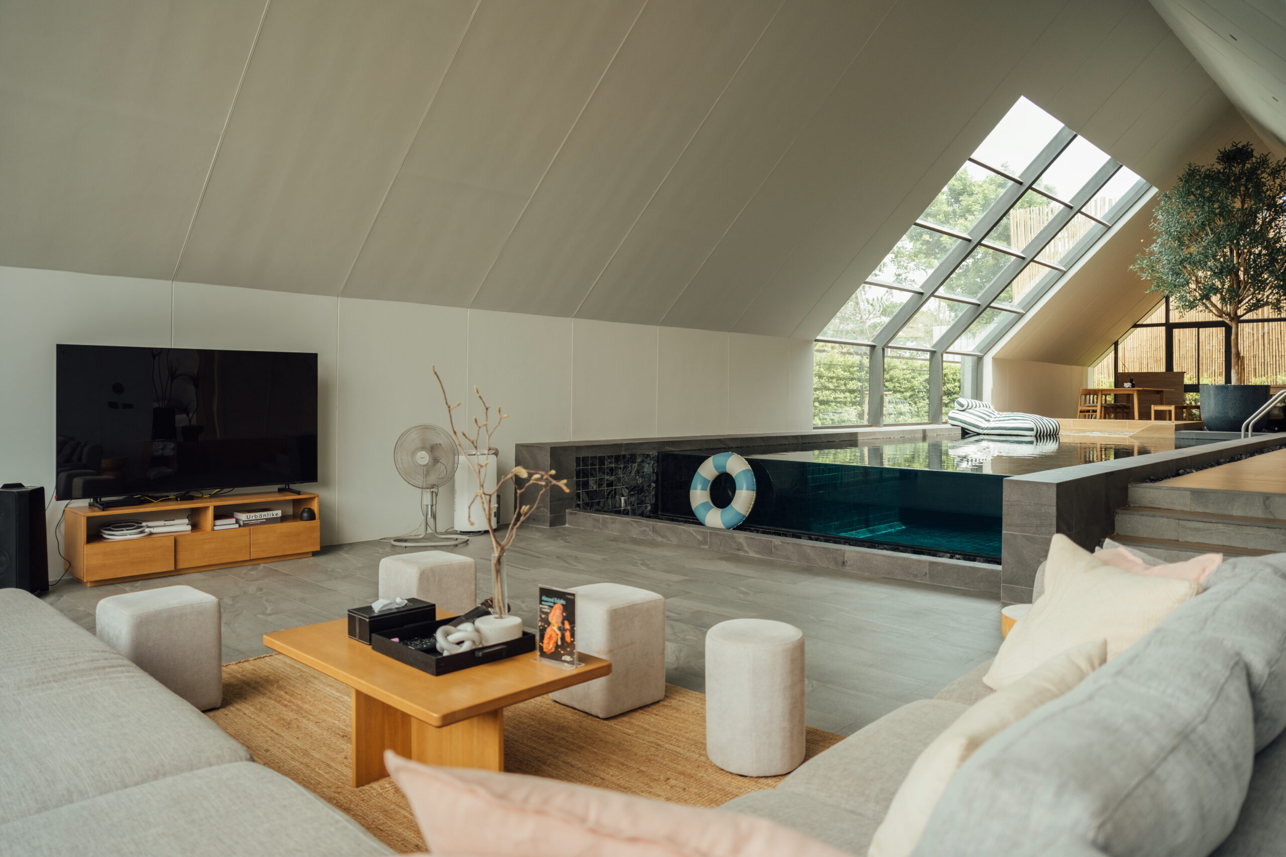 วิลล่ามาใน concept INDOOR POOL สระว่ายน้ำ | ห้องนั่งเล่น | ห้องนอน อยู่ภายในตัวบ้าน เชื่อมต่อทุก function เข้าไว้ด้วยกัน มีจุดเด่นเป็น Skylight roof กระจกบานใหญ่กลางบ้าน ทำหน้าที่เชื่อมต่อธรรมชาติภายนอกสู่ภายในตัวบ้านเข้าไว้ด้วยกัน